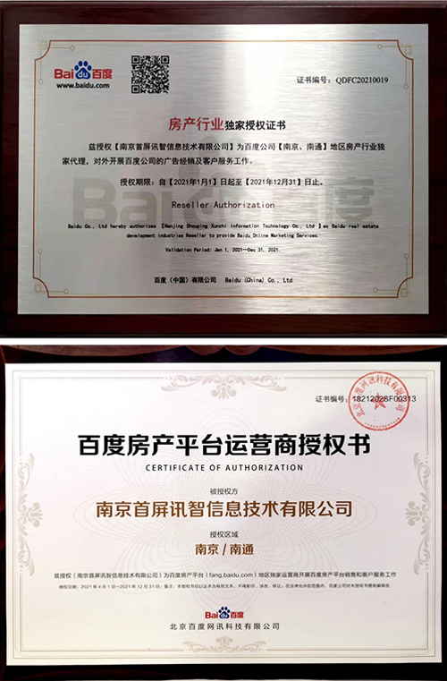 會(huì)上,百度公司正式授權(quán)南京首屏訊智信息技術(shù)有限公司為南京、南通地區(qū)房產(chǎn)行業(yè)獨(dú)家代理商及百度房產(chǎn)平臺(tái)南京、南通地區(qū)獨(dú)家運(yùn)營商,并頒發(fā)授權(quán)證書。首屏訊智自2004年成為百度合作伙伴,始終致力于為廣大企業(yè)提供優(yōu)質(zhì)的互聯(lián)網(wǎng)營銷服務(wù)。擁有17年豐富互聯(lián)網(wǎng)行業(yè)服務(wù)經(jīng)驗(yàn)的首屏訊智,已服務(wù)南京企業(yè)2萬余家,助力廣大企業(yè)快速穩(wěn)健發(fā)展。